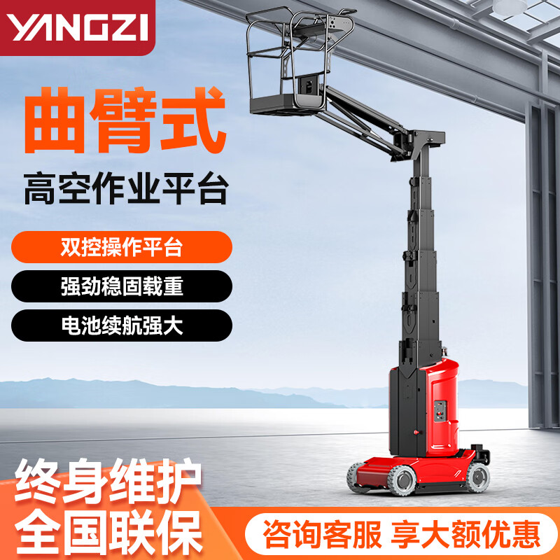 揚子曲臂式升降機CAE,雙控操作平臺,上控和地面都能控制,345度轉臺回轉,狹窄工作環境下可直立旋轉。